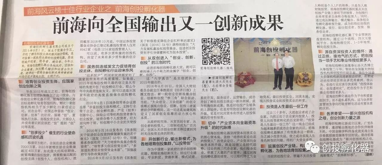 2016年,前海创投孵化器以价值、专业度、影响力被多家全国性媒体誉为“前海金融创新的新模式”,“前海向全国输出的新标准”,学界泰斗、中国金融学科终身成就奖得主张亦春教授誉之为“新兴创投机构之母,创业创新力量之源”。为解决“创业者多,创投者少”的国家级难题,国务院2016年53、54号文提出了“培育多元创投主体”“积极鼓励个人投资者从事创投”“有序引导储蓄转化为股本投资”,这些政策的出台向全国提出了孵化培育创投主体的新任务,更证明了早在一年多以前,前海创投孵化器确立的使命和体系具有前瞻性和创造性。