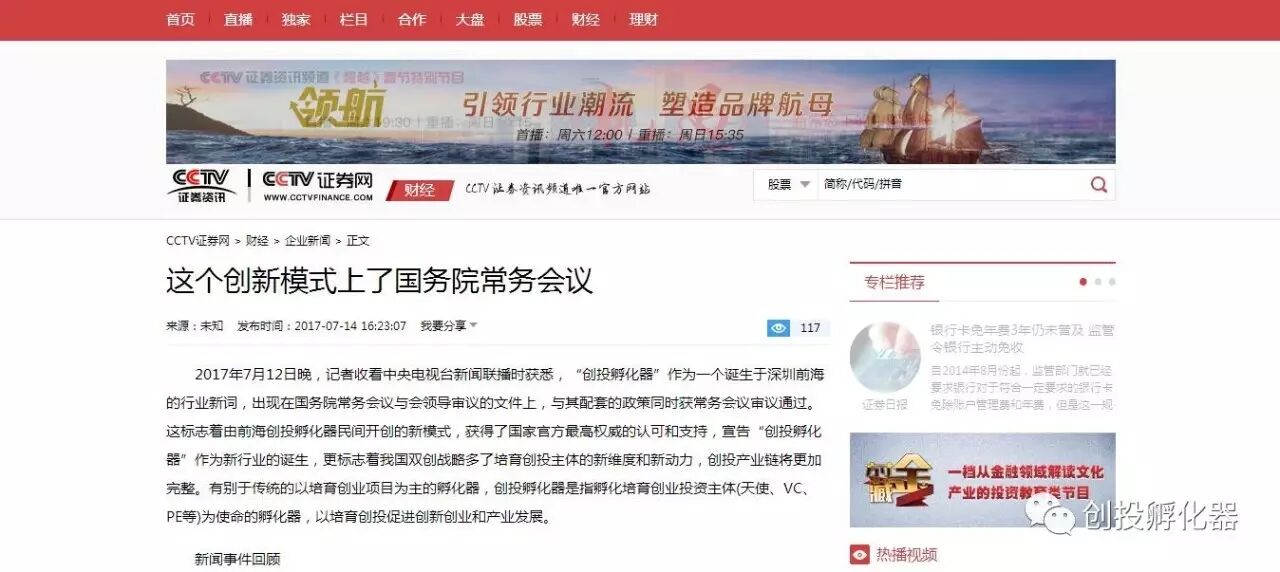 2017年7月12日晚,记者收看中央电视台新闻联播时获悉,“创投孵化器”作为一个诞生于深圳前海的行业新词,出现在国务院常务会议与会领导审议的文件上,与其配套的政策同时获常务会议审议通过。这标志着由前海创投孵化器民间开创的新模式,获得了国家官方最高权威的认可和支持,宣告“创投孵化器”作为新行业的诞生,更标志着我国双创战略多了培育创投主体的新维度和新动力,创投产业链将更加完整。有别于传统的以培育创业项目为主的孵化器,创投孵化器是指孵化培育创业投资主体(天使、VC、PE等)为使命的孵化器,以培育创投促进创新创业和产业发展。