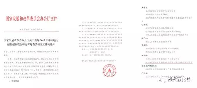 2017年6月13日,为促进创投孵化器行业研究、为政策出台提供科学决策依据,在深圳市发改委的支持和推荐下,国家发改委办公厅下发《国家发展改革委办公厅关于做好2017年中央地方创新创业联合研究课题有关研究工作的通知》文件,向前海创投孵化器下达国家发改委与地方联合研究课题——《孵化培育创业投资主体与提升创新创业平台能力建设研究》,并要求突出案例,注重转化。课题的下达,反映出国家发改委作为全国双创最高领导部门对创投孵化器模式的认可和对前海创投孵化器团队的支持,课题使前海创投孵化器在行业建设、提供政策参考等方面获得有效抓手和政府部门接口。在市发改委的指导下,课题进展顺利。