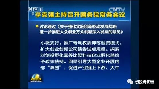 新华社北京2017年7月12日电 国务院总理李克强7月12日主持召开国务院常务会议,讨论通过《关于强化实施创新驱动发展战略进一步推进大众创业万众创新深入发展的意见》(下称<意见>)。意见共分五条,其中第三条明确提出“探索对创投孵化器等比照科技企业孵化器给予政策扶持”。