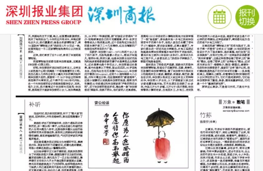 2018年5月28日,《深圳商报》刊登了著名画家雷公为前海创投孵化器【关爱自闭症儿童公益活动】创作的画作《雨伞哲学》。画家雷公作为一位专业的品牌策划人,非常热心于公益事业,他不但将《雨伞哲学》等作品以及所得稿费捐赠给前海创投孵化器的爱心项目,而且与前海创投孵化器一起行动,共同呼吁社会关注和关爱自闭症儿童群体。